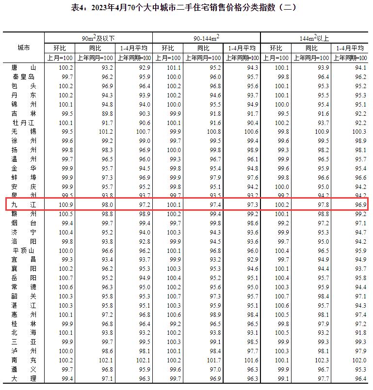 九江二手房90-144㎡售價環比上漲0.1%,同比下跌2.6%,1-4月平均同比下跌2.7%;