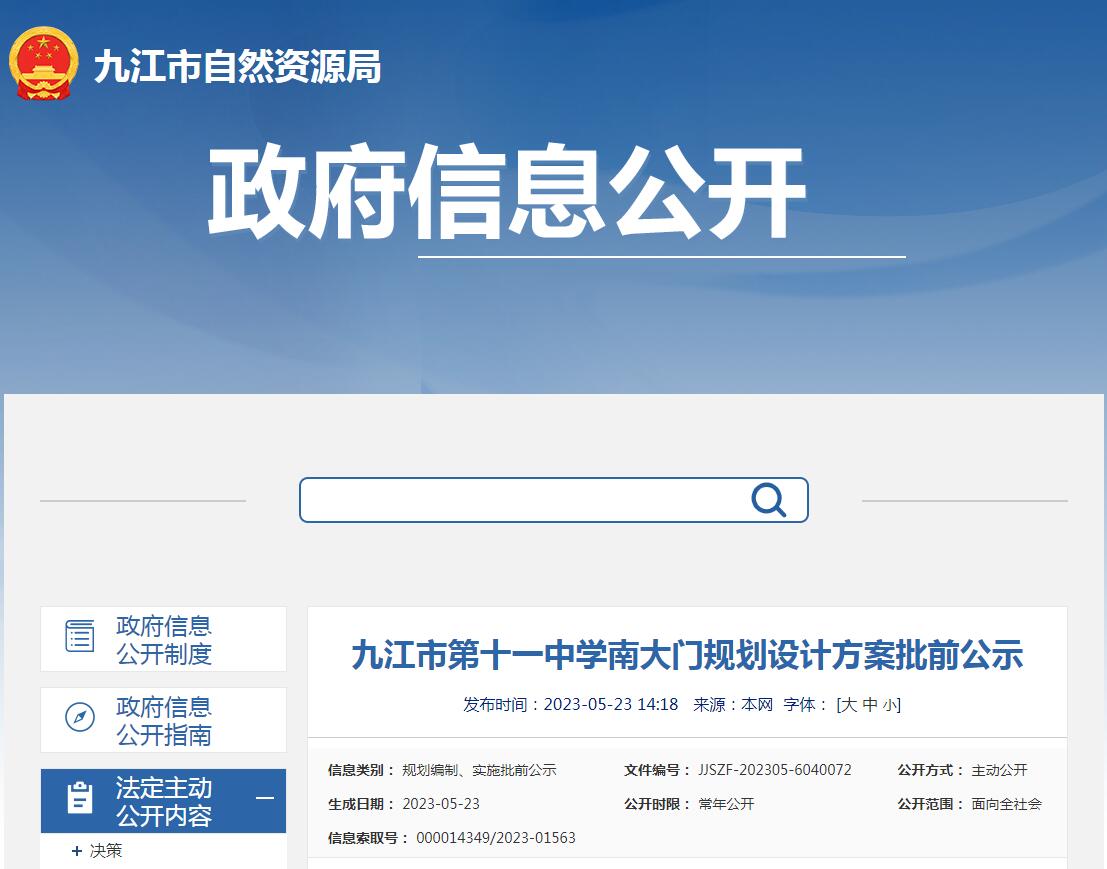 5月23日,從九江市自然資源局官網(wǎng)獲悉,九江市第十一中學(xué)南大門規(guī)劃設(shè)計(jì)方案批前公示正式發(fā)布,詳情如下: